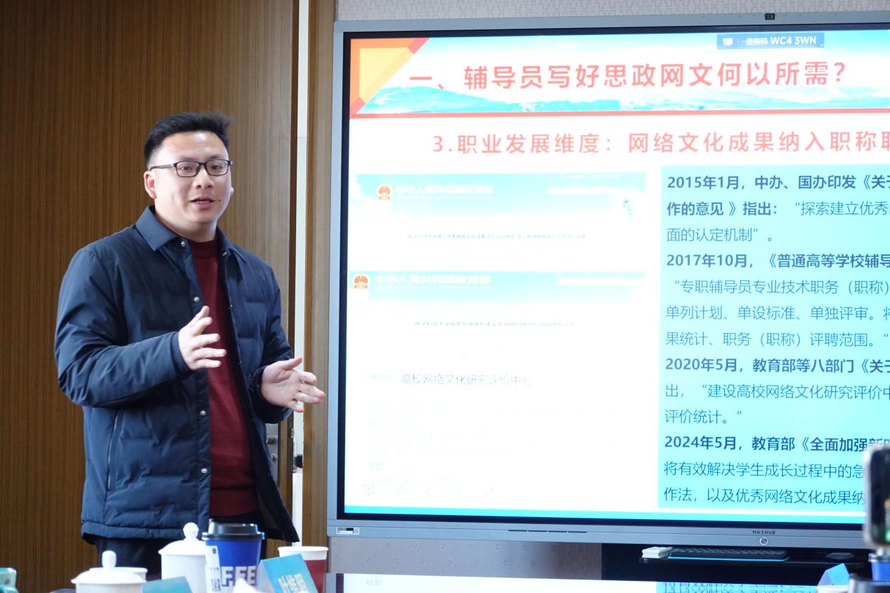 叶维明以 “辅导员开展网络思政何以所需” 为切入口,结合自身主持的 “辅导员说” 同心圆网络育人工作室,深入展开讲解。他从辅导员撰写思政网文的历史脉络出发,回顾了从1.0 门户时代到 4.0 智能网络时代的发展变迁,让在场辅导员清晰了解其演变过程。同时,针对思政网文相关赛事,叶维明进行了细致分析,并总结了优秀获奖思政网文的 “六个特征”,包括选题紧扣 “青春之问” 或彰显 “青年担当”、主题彰显 “时代特征”、内容强调 “真情实感”、逻辑框架 “结构清晰”、文风讲究 “生动活泼” 以及图文使用 “精炼准确”,为辅导员们撰写高质量思政网文提供了明确方向和借鉴。