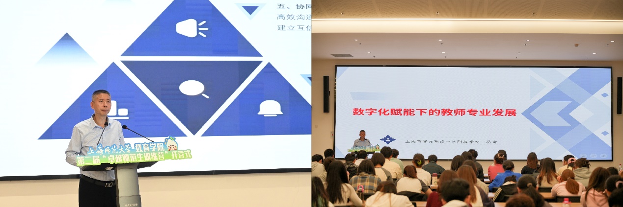 开营第一课由上海市晋元高级中学附属学校党总支副书记、晋元附校、西校、南校校长骆奇主讲。骆校长以《数字化赋能下的教师专业发展》为题,强调师范生要“明确理想目标,做好心理准备”,并从“教学”与“班主任工作”两个方面分享“如何做好老师”的心得。