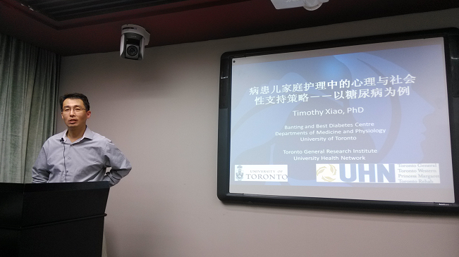 Xiao教授以糖尿病患儿为例,向大家讲述了糖尿病的病理机制,分析了患病儿的心理特征及他们的社会生活环境特征,并着重阐述了家长、教师应该为患儿提供的心理与社会性支持。Xiao教授指出,“父母、教师和同伴的接受、理解和悉心照料是患儿最可靠的心理-社会支持系统”。借助他所在的研究中心的研究成果,他向同学们展示了父母、手足和同伴对糖尿病患儿的态度、看法和可能的互动模式,阐述了糖尿病患儿的情绪体验和心理社会性特质,以及心理社会支持在糖尿病患儿成长中的作用。