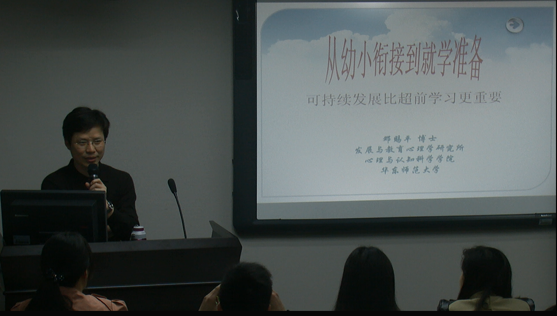 邓教授引经据典阐述了国内外幼儿教育项目的特点及幼小衔接方面的工作,指出我们在孩子就学准备方面存在的问题,并从幼儿的情绪、情感社会性以及学习和适应能力等方面提出了独到的见解。邓教授指出:幼儿的就学准备应该是可持续发展的过程,所谓准备不是幼儿园培养与小学特定学科内容相联系的内容,而是培养孩子的适应能力、学习能力与准备入学的能力等。所以,幼儿园的课程、活动设置也应能够帮助孩子更好的接受正式的学习。