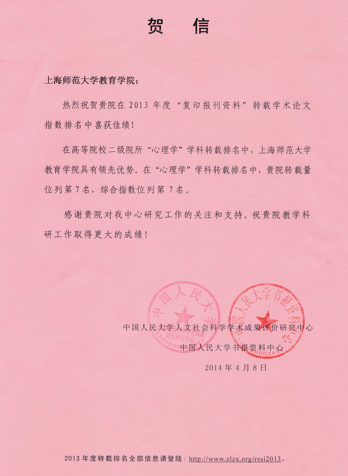 近日,我院收到中国人民大学人文社会科学学术成果评价研究中心和中国人民大学书报资料中心联合发来的贺信,在高等院校二级院所“心理学”学科转载排名中,我院具有领先优势,转载量位列第7名,综合指数位列第7名。学院衷心感谢为上述工作付出辛勤劳动的教职员工们!