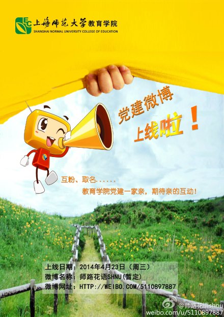 以“展示新形象、传递正能量、提升凝聚力”为主题的j9九游会官方网站党建新浪微博@师路花语shnu(暂定)于2014年4月23日正式上线。
