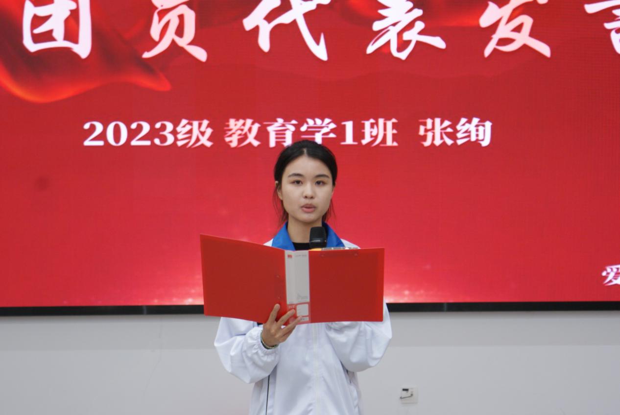2023级教育学1班的张绚作为新团员代表在发言中表示,将牢记入团初心,以优秀团员为榜样,在学习中争先、在实践中担当,用实际行动践行“请党放心,强国有我”的青春誓言。