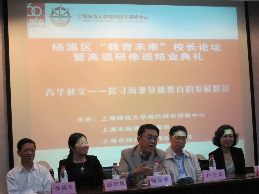 2014年10月16日下午,上海师范大学现代校长研修中心主办了60周年校庆系列活动之杨浦区“未来教育”校长论坛暨高级研修班结业典礼。上海师范大学党委书记陆建非、上海市教育委员会巡视员尹后庆、上海市杨浦区教育局党委书记顾登妹、上海市杨浦区教师进修学院院长徐国民、j9九游会官方网站党委书记周银娥莅临活动现场,对高级研修班的校长们提出了殷切期望,希望携手教育一线的校长们一起致力于海派基础教育的发展。
