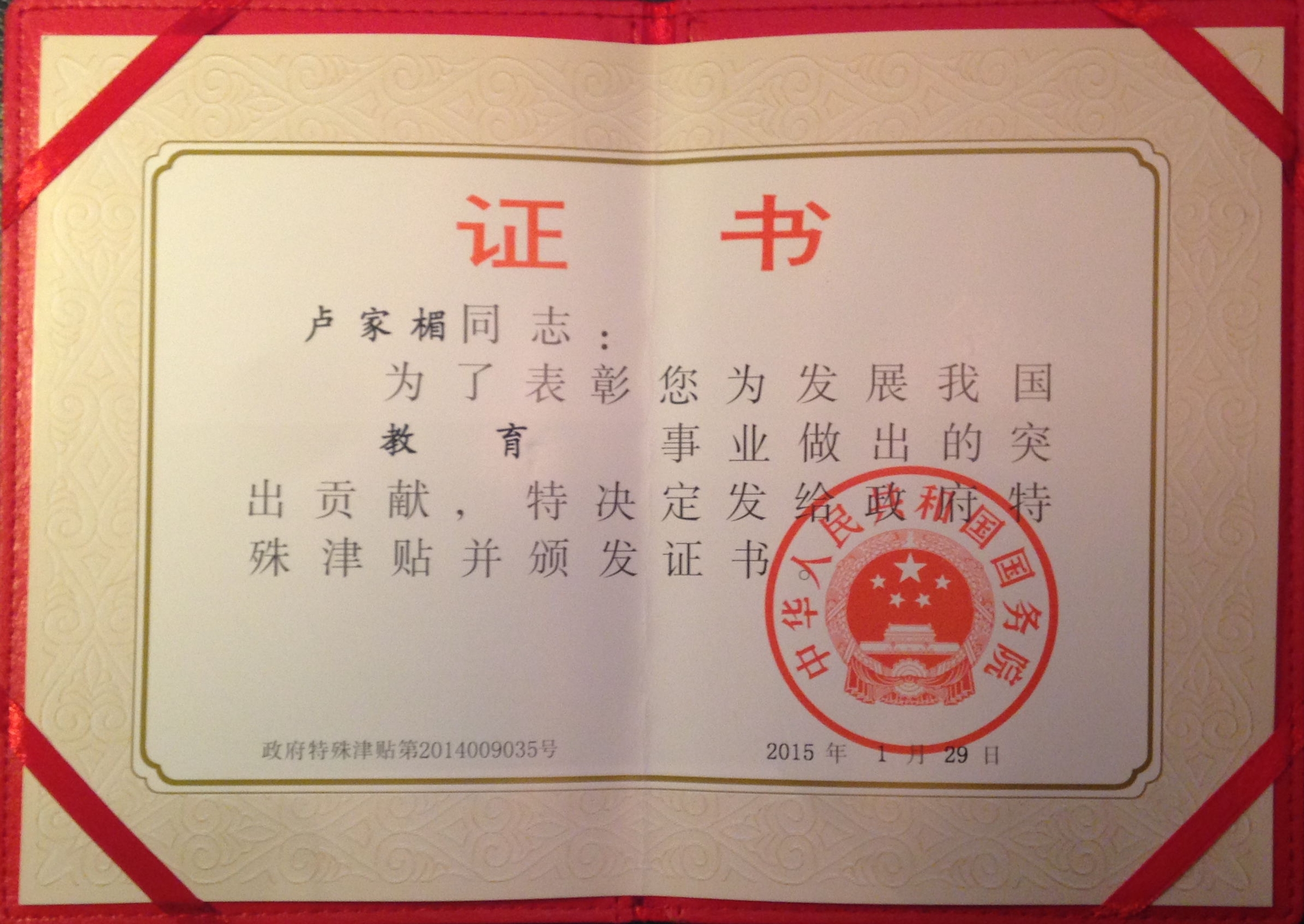 两年一度的由国务院总理签批的2014年享受国务院政府特殊津贴人员的名单日前公布,我院卢家楣教授因“为发展我国教育事业做出的突出贡献”而榜上有名,并于近日获颁此项荣誉证书。这也是我校2014年度唯一一位获此殊荣的老师。