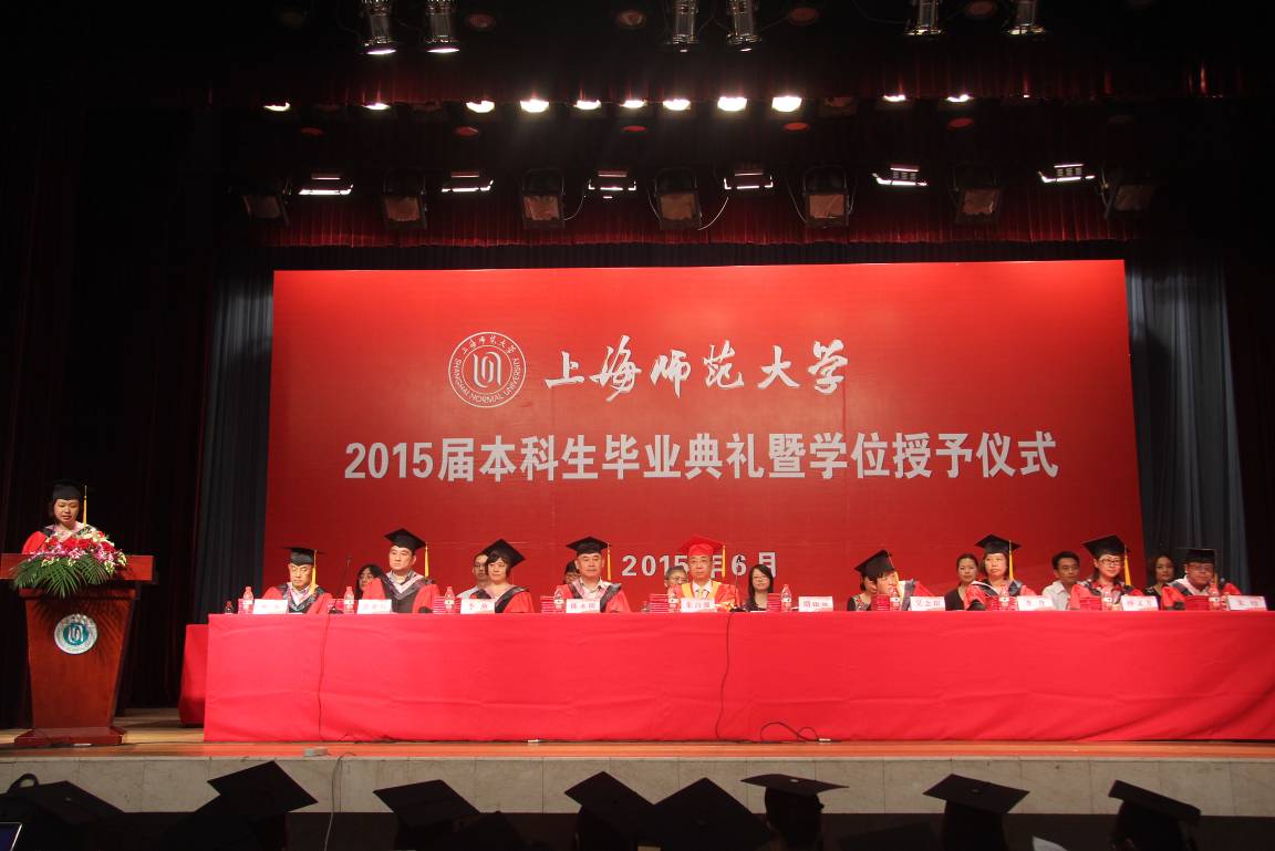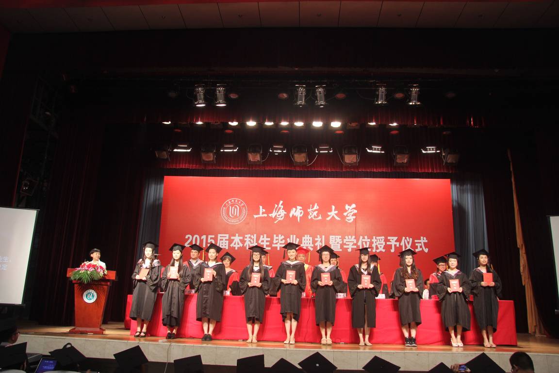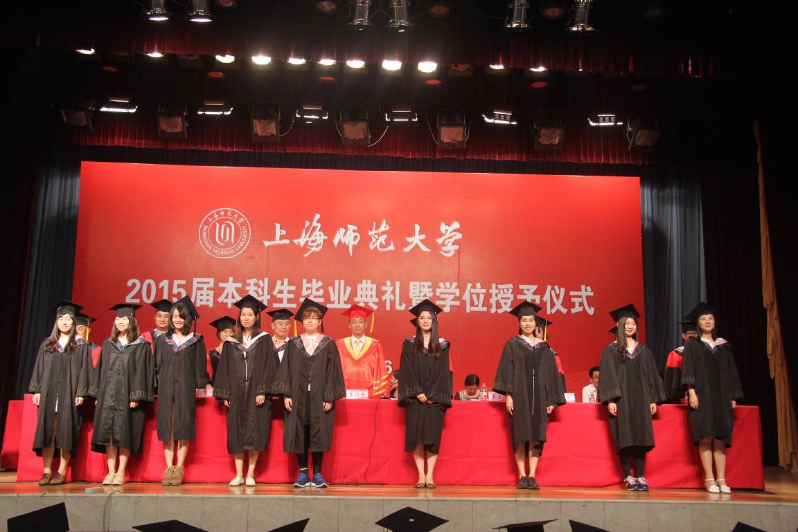 雄壮的国歌声后,j9九游会官方网站党委书记周银娥老师为全体毕业生致辞,周老师将亲切的祝福、殷切的希望送给毕业生们,希望大家在崭新的人生旅程中,胸怀梦想、肩负使命、勇于践行。随后进行了2015年上海市高等学校优秀毕业生和上海师范大学优秀毕业生的表彰。在教师代表和学生代表发言之后,是庄重的学士学位授予仪式。之后,毕业生们庄严宣誓,毕业后将以才智服务社会,在未来的岗位上奉献青春!最后,全体毕业生以深深地一鞠躬表达了对家长及教师们的感恩之情,与同学彼此拥抱,互相感谢、祝福。