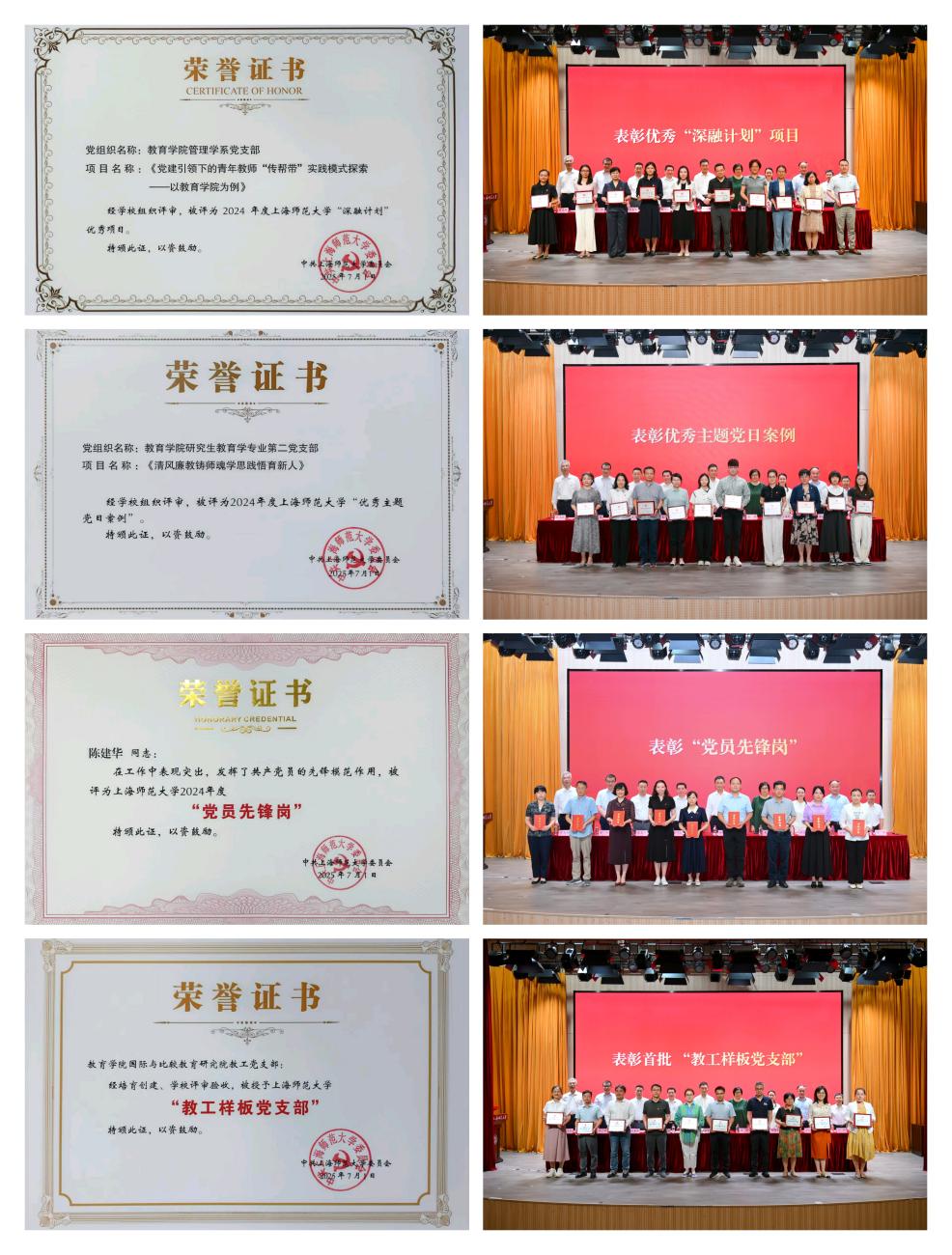 在此次座谈会中,我院多项工作获得表彰。管理学系党支部《党建引领下的青年教师“传帮带”实践模式探索——以j9九游会官方网站为例》被评为2024年度上海师范大学“深融计划”优秀项目;研究生教育学专业第二党支部的《清风廉教铸师魂 学思践悟育新人》被评为2024年度上海师范大学“优秀主题党日案例”;教育学系党支部陈建华同志因工作表现突出,被评为上海师范大学2024年度“党员先锋岗”。国际与比较教育研究院党支部经培育创建和学校评审验收,被授予上海师范大学“教工样板党支部”称号。